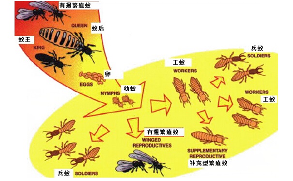白蟻的種類有很多種,中國已知有白蟻4科、47屬、480多種,國內(nèi)28個?。ㄊ小⒆灾螀^(qū))均有分布。其中危害較嚴(yán)重的有土木棲的鼻白蟻科乳白蟻屬的家白蟻(臺灣乳白蟻)、散白蟻、土棲的黑翅大白蟻、堆砂白蟻、黃胸散白蟻等,對房屋建筑危害最嚴(yán)重的是家白蟻。